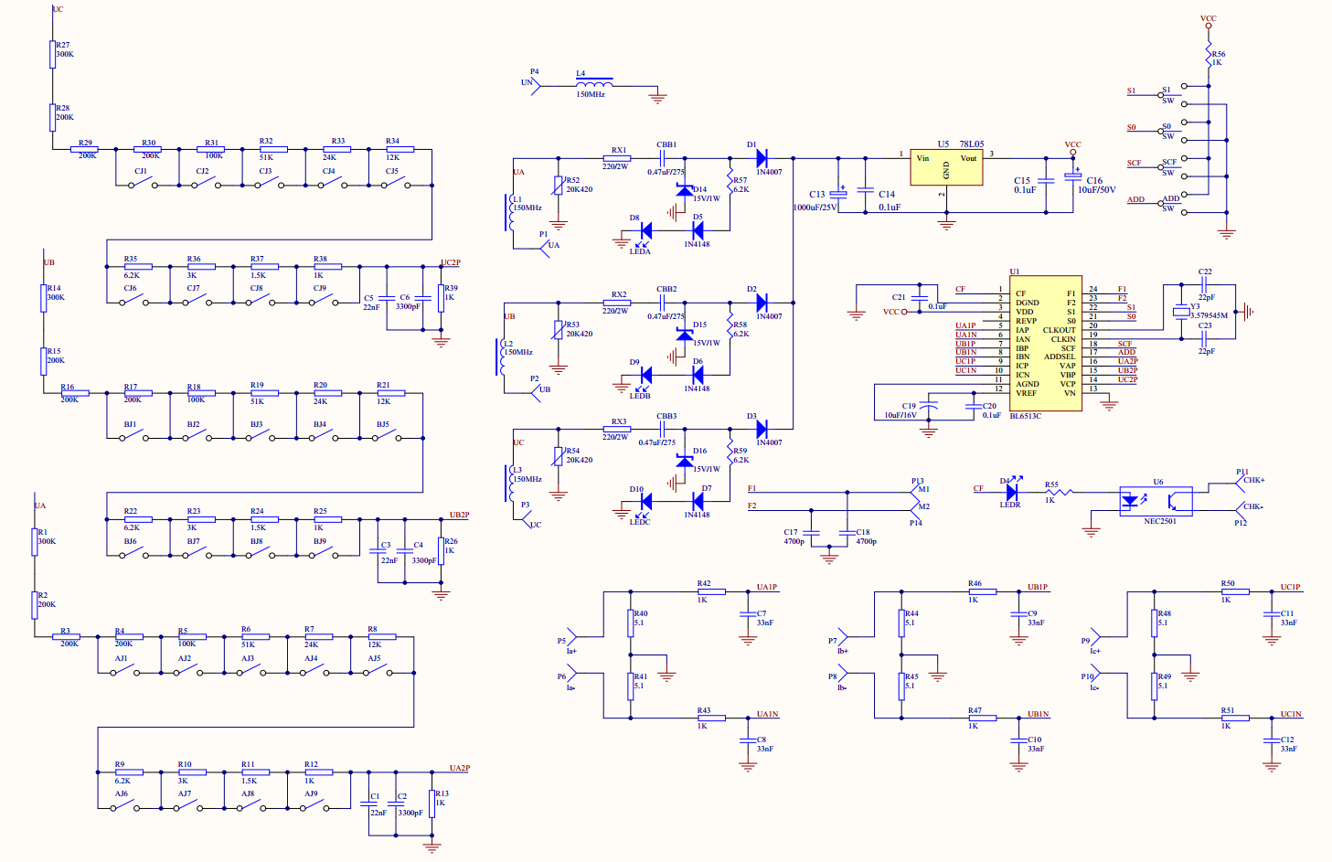 BL6513C是三相电子电度表的核心计量芯片,采用低功耗设计,芯片静态功耗 25mW(典型值),因此可以采用三相阻容分压电源,大大降低了生产成本。基于此芯片设计的三相电子电度表具有外围电路简单、精度高、稳定性好等特点,适用于三相三线和三相四线电力用户的电能计量