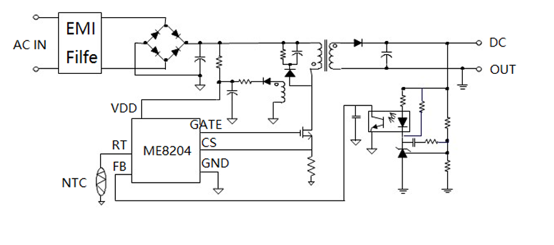 ME8202 is a highly integrated current mode PWM control IC optimized for high performance, low standby power and cost effective offline flyback converter applications. PWM switching frequency at normal operation is externally programmable and trimmed to tight range. At no load or light load condition, the IC operates in extended ‘burst mode’ to minimize switching loss. Lower standby power and higher conversion efficiency is thus achieved.VDD low startup current and low operating current contribute to a reliable power on startup design with ME8202. A large value resistor could thus be used in the startup circuit to minimize the standby power. The internal slope compensation improves system large signal stability and reduces the possible subharmonic oscillation at high PWM duty cycle output. Leading-edge blanking on current sense input removes the signal glitch due to snubber circuit diode reverse recovery and thus greatly reduces the external component count and system cost in the design. ME8202 offers complete protection coverage with automatic self-recovery feature including Cycle-by-Cycle current limiting (OCP), over load protection (OLP), VDD over voltage clamp and under voltage lockout (UVLO). The Gate-drive output is clamped at 16V to protect the power MOSFET. In ME8202,OCP threshold slope is internally optimized to reach constant output power limit over universal AC input range. Excellent EMI performance is achieved with frequency shuffling technique together with soft switching control at the totem pole gate drive output. Tone energy at below 20KHZ is minimized in the design and audio noise is eliminated during operation.