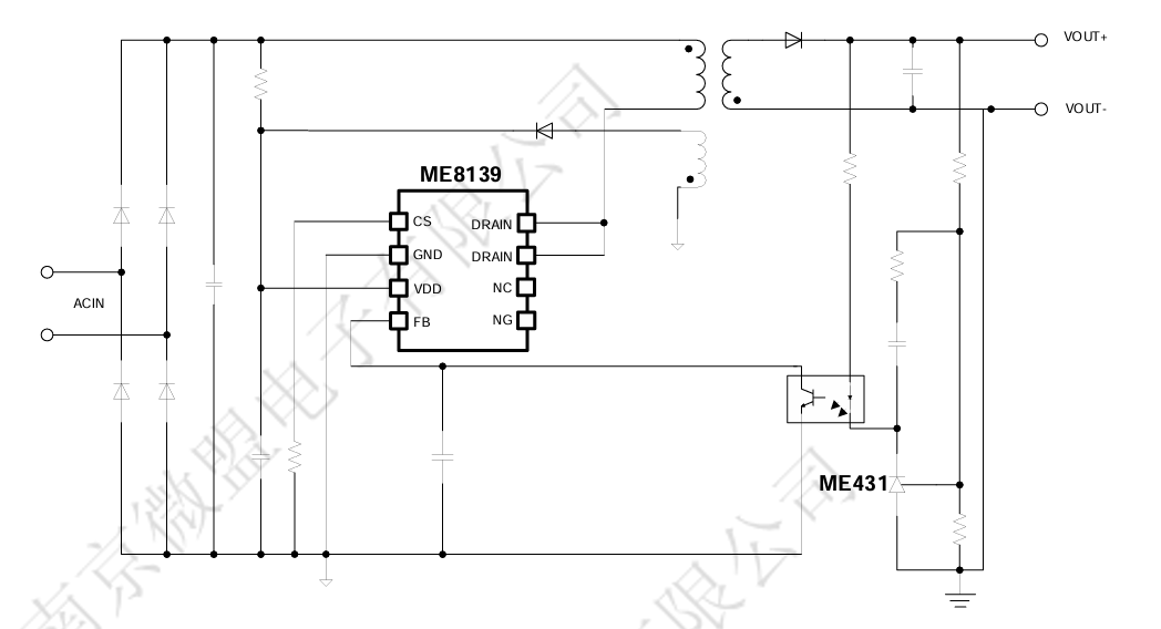The ME8139B is a highly integrated current mode PWM controller with a high voltage GaN of 650V optimized for high performance off-line power converters. ME8139B features a constant power mode. VDD low startup current and low operating current contribute to a tiny power consumption and reliable power on startup. ME8139B features a auto-tuning circuit combined with a steering charge pump, reducing the stress of secondary synchronous rectifier effectively. ME8139B offers a wide VDD supply range from 9.5V to 82V. The IC operates in a maximum frequency of 130KHz @Full Load, As the load gradually decreases, the IC operates in Green Mode and Extended Burst Mode to minimize the standby power loss. EMI performance is also optimized by Frequency Jittering and Peak Current Jittering. ME8139B offers comprehensive protection coverage including Cycle-by-Cycle current limiting (OCP), Over Load Protection (OLP), VDD Under Voltage Lockout (UVLO), Over Temperature Protection (OTP), VDD Over Voltage Protection (VDD OVP), Leading Edge Blanking (LEB) and CS Open Protection (SCB).