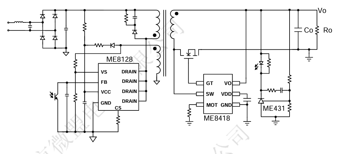 ME8128 拥有完善的保护功能,包括:逐周期电流 限制(OCP),过载保护(OLP),欠压锁定(UVLO), VCC 过压保护(VCC OVP),过温保护(OTP)、CS 管脚开路保护(SCB)、内置软启动、前沿消隐(LEB) 等,以确保系统可靠的工作。