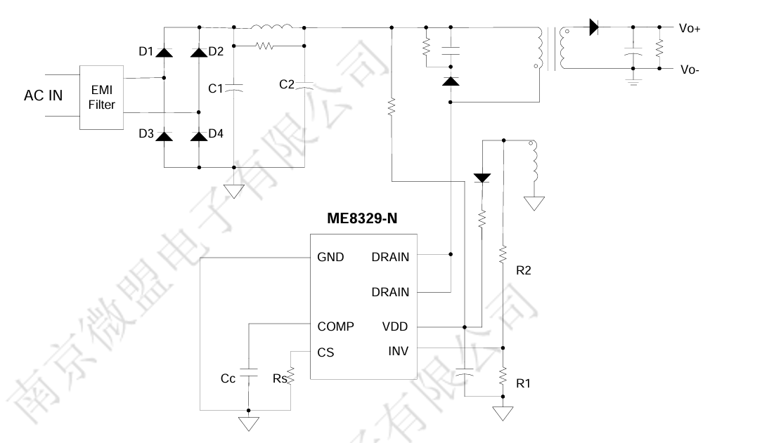 ME8329-N 是一款满足六级能效标准原边反馈准谐振模式的小功率 AC/DC 电源控制芯片。内部集成高压功率 MOS 管,用于充电器,适配器和 LED 驱动领域。实现±5%的恒压恒流精度和小于 60mW 的待机功耗。在恒压模式下内置了线电压补偿功能。采用准谐振控制,实现高效率和良好的 EMI 性能,满足六级能效标准要求。